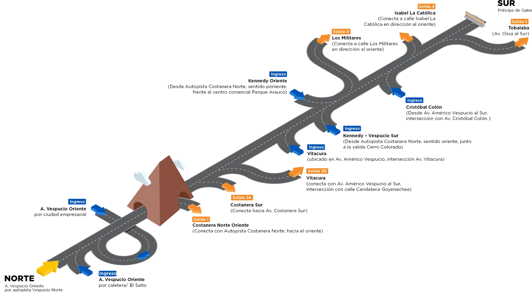 Más informaciónDescubre los accesos y salidas de la nueva Autopista Vespucio Oriente que conecta entre Av. El Salto y Príncipe de Gales.